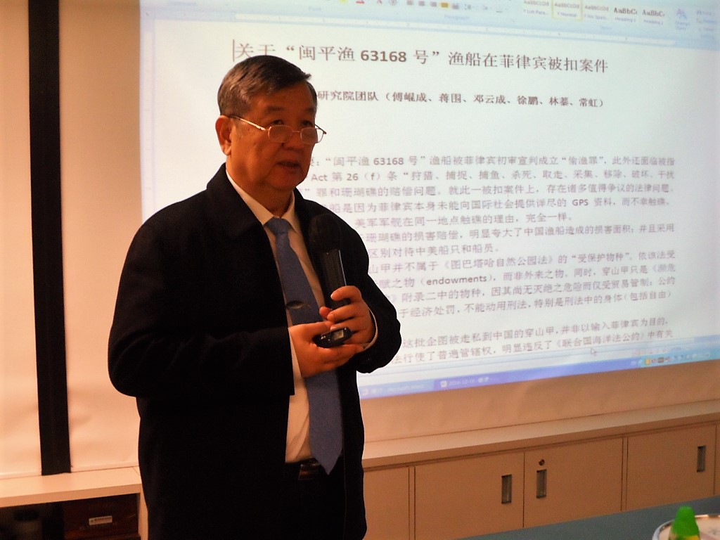 16日晚的渔业人权学术研讨会由香港理工大学的吕锦山教授主持。厦门大学南海研究院院长、《中国海洋法学评论》主编傅崐成教授,首先作了题为《渔民人权与海上武力执法》的报告,就“闽平渔63168号”渔船在菲律宾被扣案件进行分析与讨论。之后,来自大连海事大学的黄芬副教授就渔业权的构造从民法的角度对其进行了阐释。最后,来自亚太渔业养护中心(APFP)的研究员王丹维女士对2016年来中心在印尼、菲律宾等地的调研成果进行了汇报,并提出了法律政策上可行的建议。会后,澳门大学法学院讲座教授莫世健老师对三位的精彩演讲做了点评。在场学生也积极提问、踊跃交流。