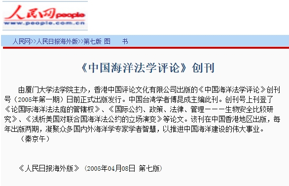 由厦门大学法学院主办,香港中国评论文化有限公司出版的《中国海洋法学评论》创刊号(2005年第一期)日前正式出版发行。中国台湾学者傅崐成主编此刊。创刊号上刊登了《论国际海洋法法庭的管辖权》《国际公约、政策、法律、管理———生物安全比较研究》《浅析美国对联合国海洋法公约的立场演变》等论文。该刊在中国香港地区出版,每年出版两期,凝聚众多国内外海洋学专家学者智慧,以推进中国海洋建设的伟大事业。